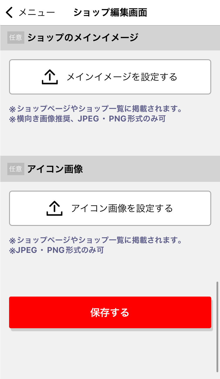 メニューの「ショップ情報」をタップすると、ショップ名・事業内容・webサイトのURL等の編集をする画面に移動できます。