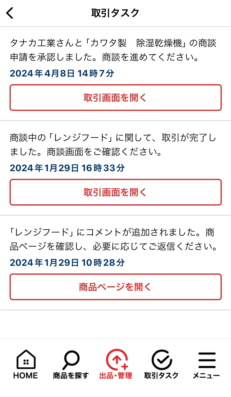 申請が承諾されると商談画面が開設され、チャット機能を使った商談が可能になります。下部メニューの「取引タスク」をタップして取引タスクの一覧画面へ移動してください。