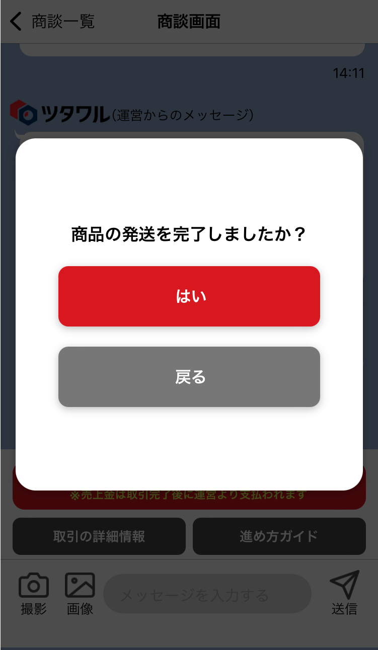 「商品を発送し、このボタンを押してください」をタップすると、確認画面が表示されるので「はい」で発送登録を確定させてください。