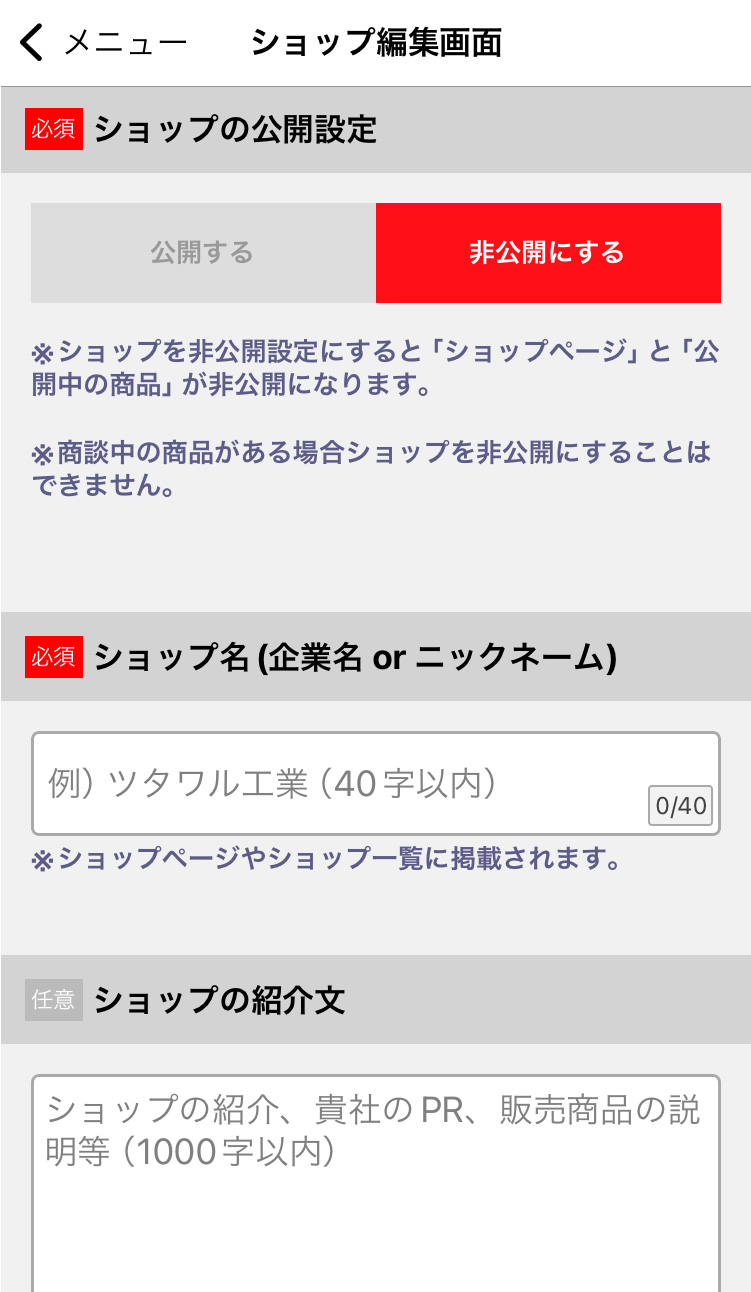 ショップの公開・非公開の切り替え、ショップ画像の設定、紹介文の変更などが可能です。