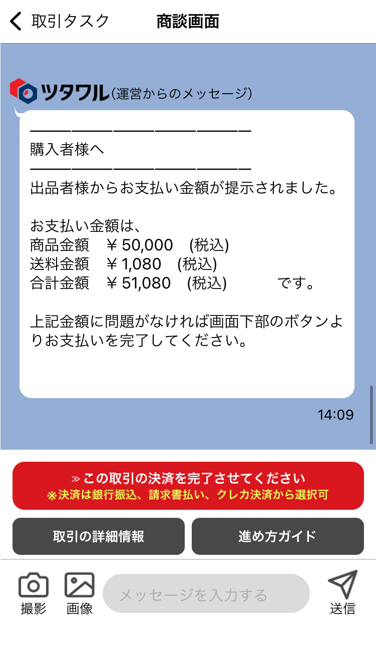 出品者が送料を確定させる操作を行うと、決済ができるようになります。「この取引の決済を完了させてください」をタップしてください。
