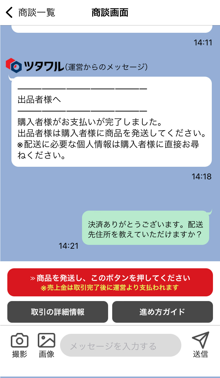 ツタワル運営からの発送の指示がありましたら、購入者の配送希望住所に商品を発送してください。住所や担当者氏名、配送希望日時など、発送手続きに必要な情報は購入者に直接質問してください。発送が完了したら「商品を発送し、このボタンを押してください」をタップしてください。 ※配送代行サービスをご利用の場合、ツタワルが手配する運送会社が集荷に伺う日程のご連絡や購入者への配送の連絡を代行します。