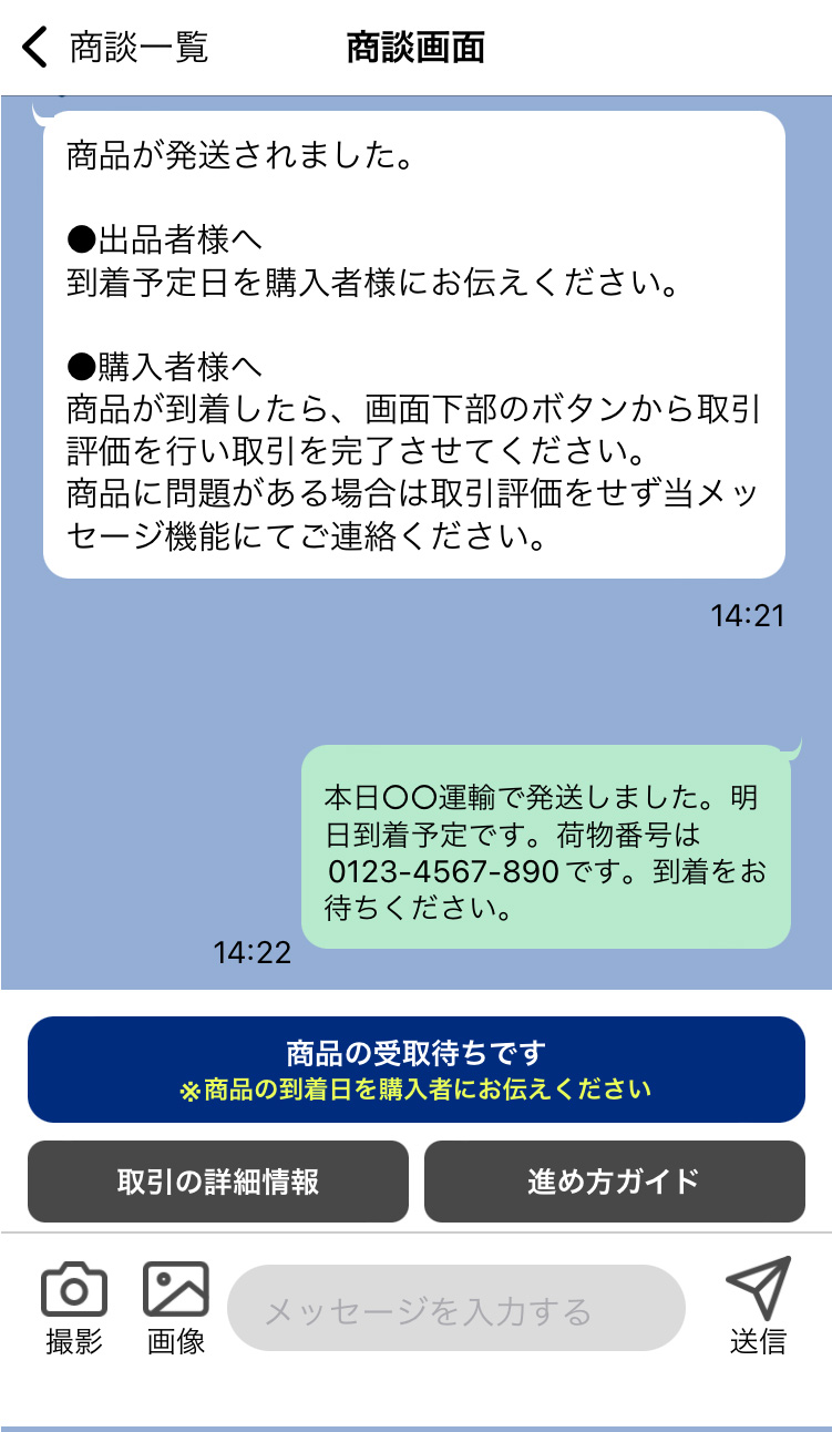 到着予定日や荷物番号が分かる場合、チャット機能で購入者にお知らせください。