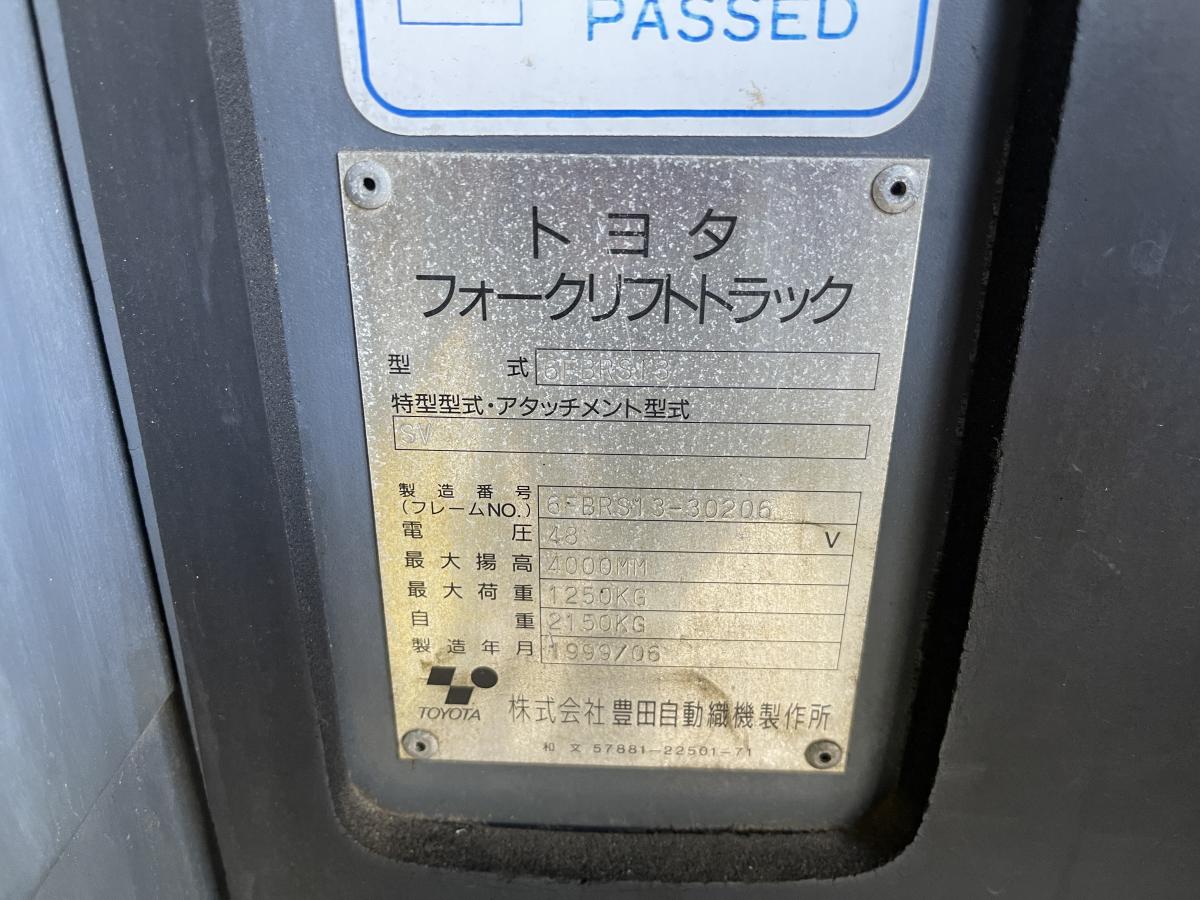 メーカー型式:トヨタ6FBR13 最大揚高:4000㎜ 最大荷重:1250㎏ 自重:2150kg 製造年月:1999年6月